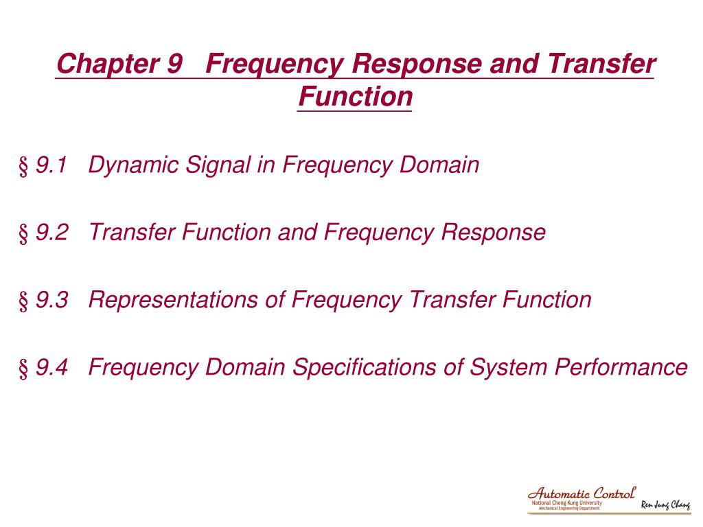Chapter 9 Frequency Response and Transfer Function. § 9.1 Dynamic Signal in Frequency Domain § 9.2 Transfer Function and Frequency Response § 9.3 Representations of Frequency Transfer Function § 9.4 Frequency Domain Specifications of System Performance.