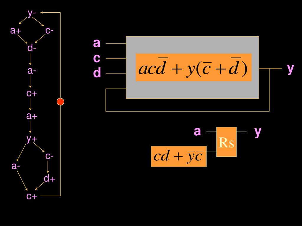 x y- y w 1001 1011 z z- w- y 1000 0001 w+ z y+ x w- z- x+ w 1010 0000 0101 0011 w w- y+ x+ z- C z y z 0010 0100 x- x+ y+ y z+ C 0110 0111 x z y yz=0 yz=1 Decomposition example y- 1001 1011 z- w- 1000 0001 w+ y+ w- z- x+ 1010 0000 0101 0011 w- y+ x+ z- 0010 0100 x- x+ y+ z+ 0110 0111 ASPDAC / VLSI 2002 - Tutorial on Logic Design of Asynchronous Circuits