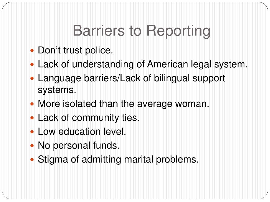 Barriers to Reporting • Don’t trust police. • Lack of understanding of American legal system. • Language barriers/Lack of bilingual support systems. • More isolated than the average woman. • Lack of community ties. • Low education level. • No personal funds. • Stigma of admitting marital problems.
