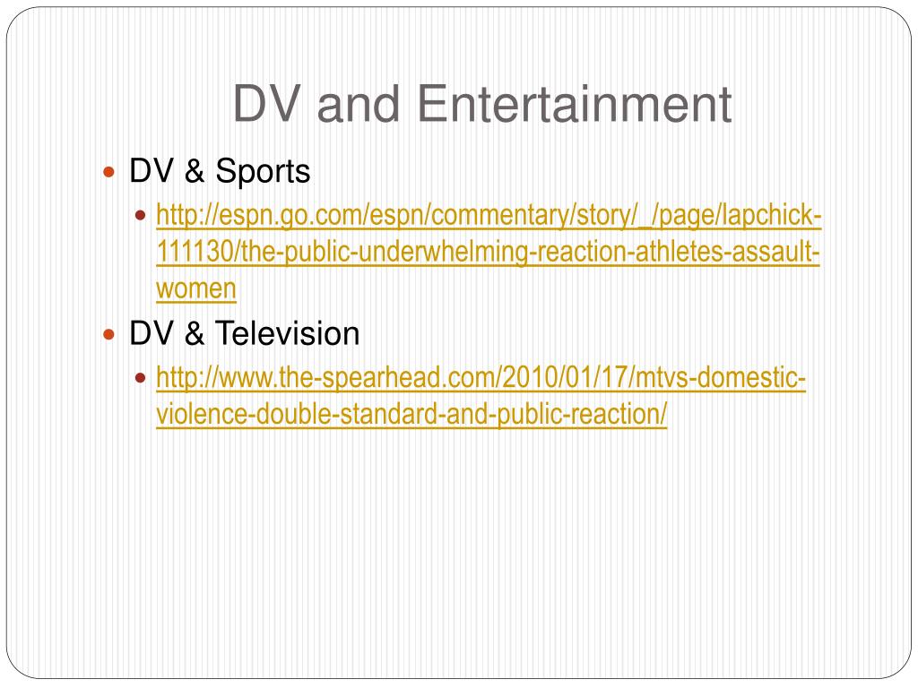 DV and Entertainment • DV & Sports • http://espn.go.com/espn/commentary/story/_/page/lapchick-111130/the-public-underwhelming-reaction-athletes-assault-women • DV & Television • http://www.the-spearhead.com/2010/01/17/mtvs-domestic-violence-double-standard-and-public-reaction/