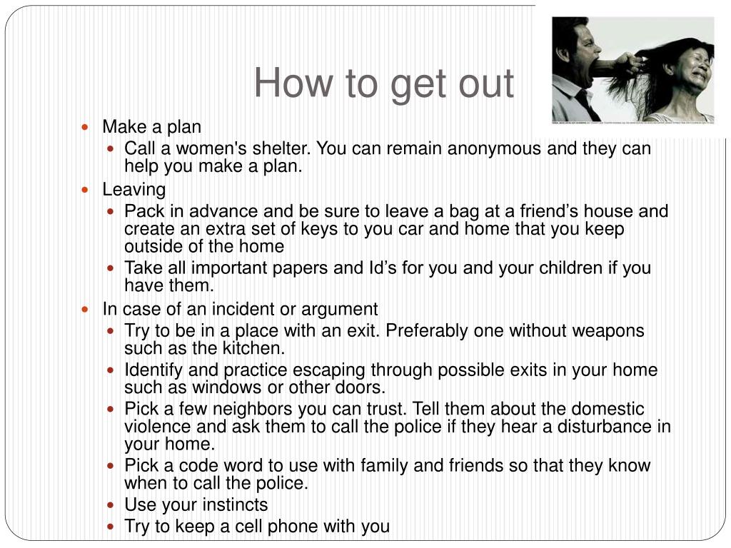 How to get out • Make a plan • Call a women's shelter. You can remain anonymous and they can help you make a plan. • Leaving • Pack in advance and be sure to leave a bag at a friend’s house and create an extra set of keys to you car and home that you keep outside of the home • Take all important papers and Id’s for you and your children if you have them. • In case of an incident or argument • Try to be in a place with an exit. Preferably one without weapons such as the kitchen. • Identify and practice escaping through possible exits in your home such as windows or other doors. • Pick a few neighbors you can trust. Tell them about the domestic violence and ask them to call the police if they hear a disturbance in your home. • Pick a code word to use with family and friends so that they know when to call the police. • Use your instincts • Try to keep a cell phone with you