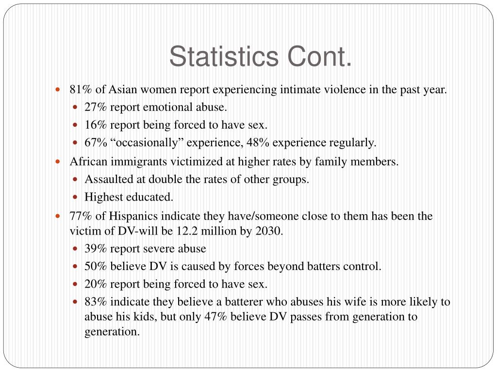 Statistics Cont. • 81% of Asian women report experiencing intimate violence in the past year. • 27% report emotional abuse. • 16% report being forced to have sex. • 67% “occasionally” experience, 48% experience regularly. • African immigrants victimized at higher rates by family members. • Assaulted at double the rates of other groups. • Highest educated. • 77% of Hispanics indicate they have/someone close to them has been the victim of DV-will be 12.2 million by 2030. • 39% report severe abuse • 50% believe DV is caused by forces beyond batters control. • 20% report being forced to have sex. • 83% indicate they believe a batterer who abuses his wife is more likely to abuse his kids, but only 47% believe DV passes from generation to generation.