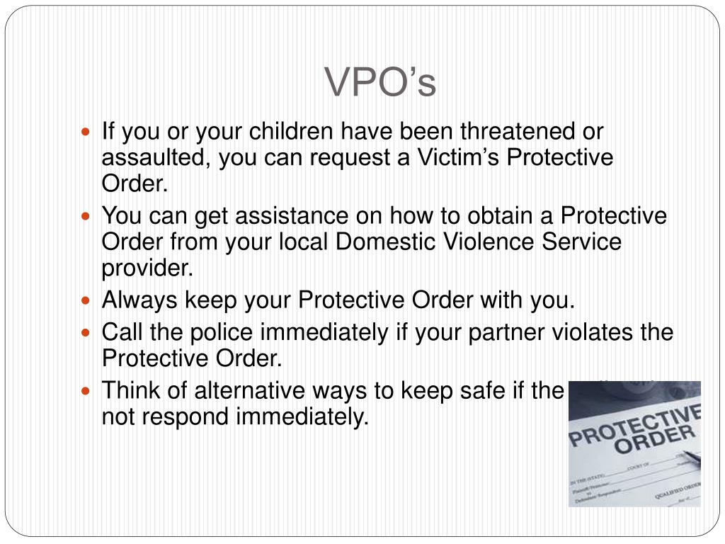 VPO’s • If you or your children have been threatened or assaulted, you can request a Victim’s Protective Order. • You can get assistance on how to obtain a Protective Order from your local Domestic Violence Service provider. • Always keep your Protective Order with you. • Call the police immediately if your partner violates the Protective Order. • Think of alternative ways to keep safe if the police do not respond immediately.