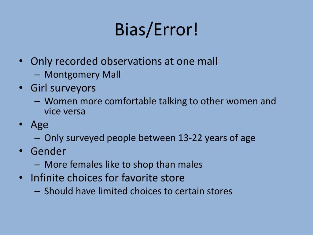 Bias/Error! • Only recorded observations at one mall • Montgomery Mall • Girl surveyors • Women more comfortable talking to other women and vice versa • Age • Only surveyed people between 13-22 years of age • Gender • More females like to shop than males • Infinite choices for favorite store • Should have limited choices to certain stores