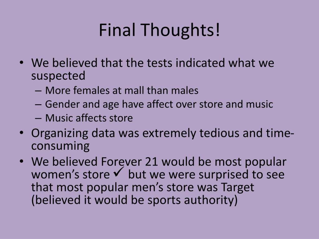 Final Thoughts! • We believed that the tests indicated what we suspected • More females at mall than males • Gender and age have affect over store and music • Music affects store • Organizing data was extremely tedious and time-consuming • We believed Forever 21 would be most popular women’s store but we were surprised to see that most popular men’s store was Target (believed it would be sports authority)