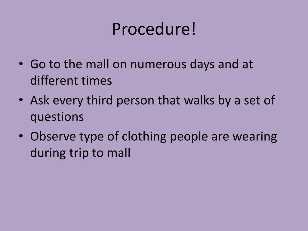 Procedure! • Go to the mall on numerous days and at different times • Ask every third person that walks by a set of questions • Observe type of clothing people are wearing during trip to mall