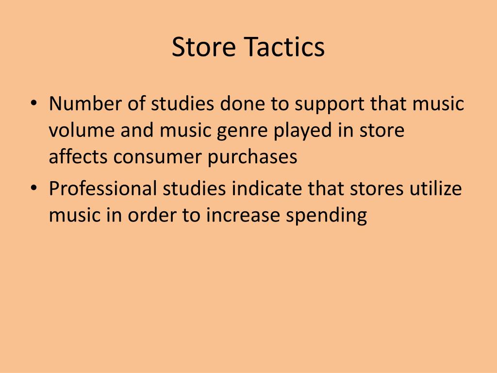 Store Tactics • Number of studies done to support that music volume and music genre played in store affects consumer purchases • Professional studies indicate that stores utilize music in order to increase spending