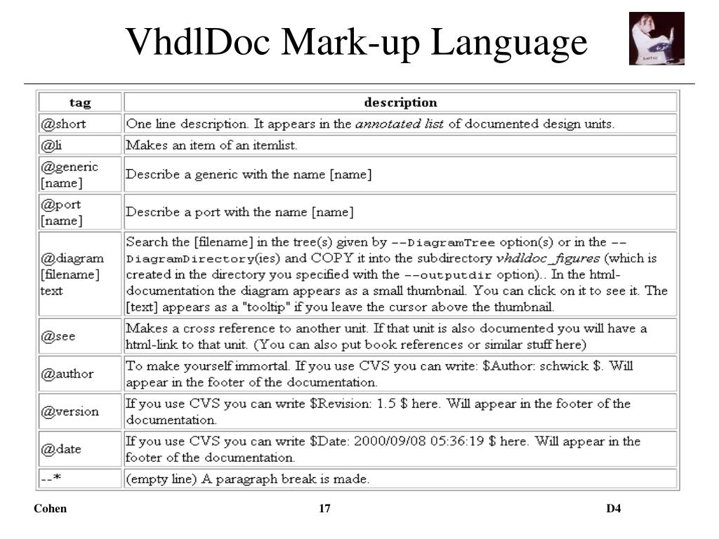 VHDLDOC -- GNU TOOL • Automatically generates hyperlinked html-documentation of VHDL Code. • Hierarchy, Ports, Generics, Packages, Source code, Documents (e.g., requirements, plans), Images • The markup-language is like the one of JAVADOC. • Runs on Unix/Linux. • Results can be made compatible with windows with awk program File naming issue. (see next slide for fix). • Freely available at: http://schwick.home.cern.ch/schwick/vhdldoc/Welcome.html