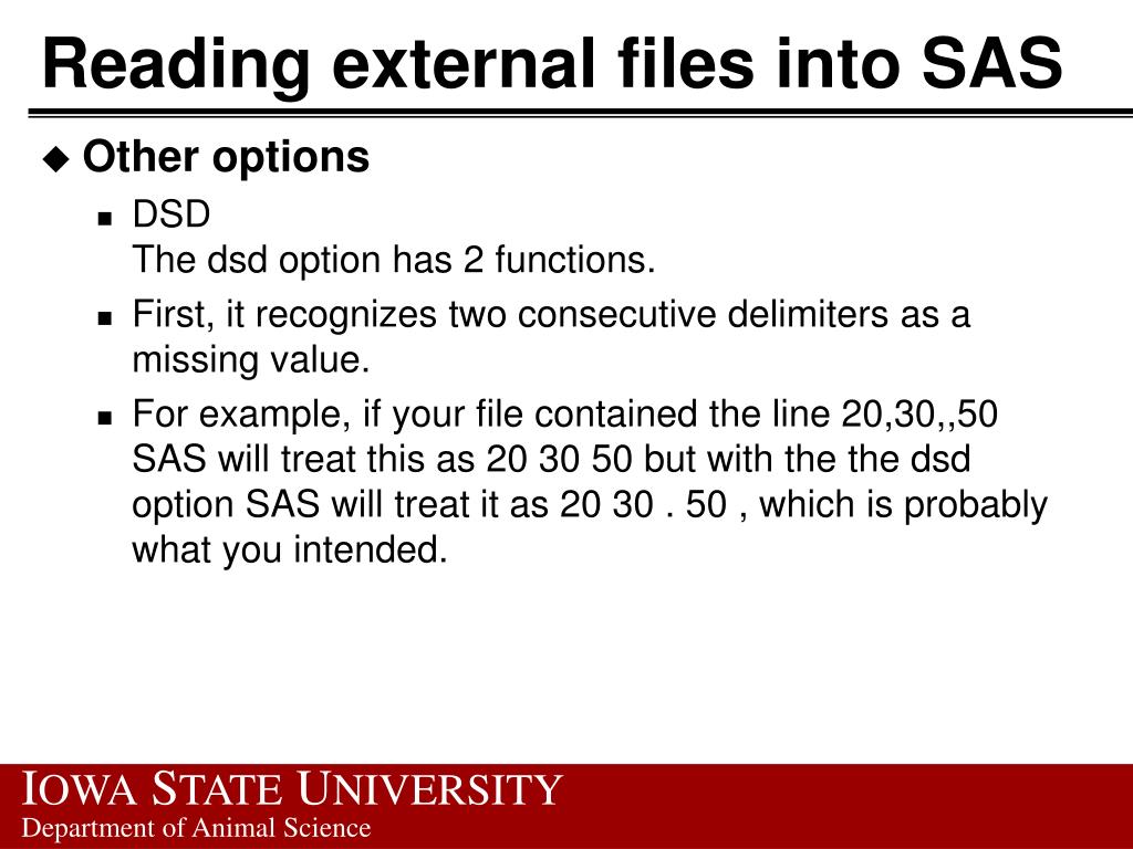 Reading external files into SAS • Other options • DSD The dsd option has 2 functions. • First, it recognizes two consecutive delimiters as a missing value. • For example, if your file contained the line 20,30,,50 SAS will treat this as 20 30 50 but with the thedsd option SAS will treat it as 20 30 . 50 , which is probably what you intended.