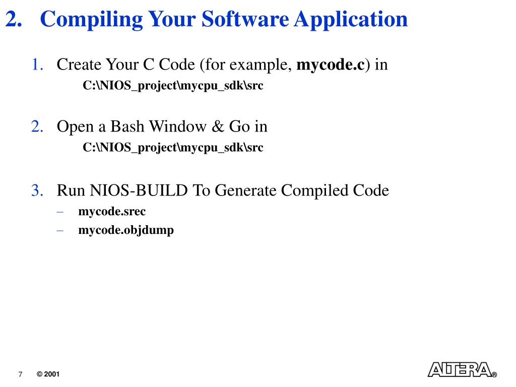 Compiling Your Software Application • Create Your C Code (for example, mycode.c) in C:\NIOS_project\mycpu_sdk\src • Open a Bash Window & Go in C:\NIOS_project\mycpu_sdk\src • Run NIOS-BUILDTo Generate Compiled Code • mycode.srec • mycode.objdump