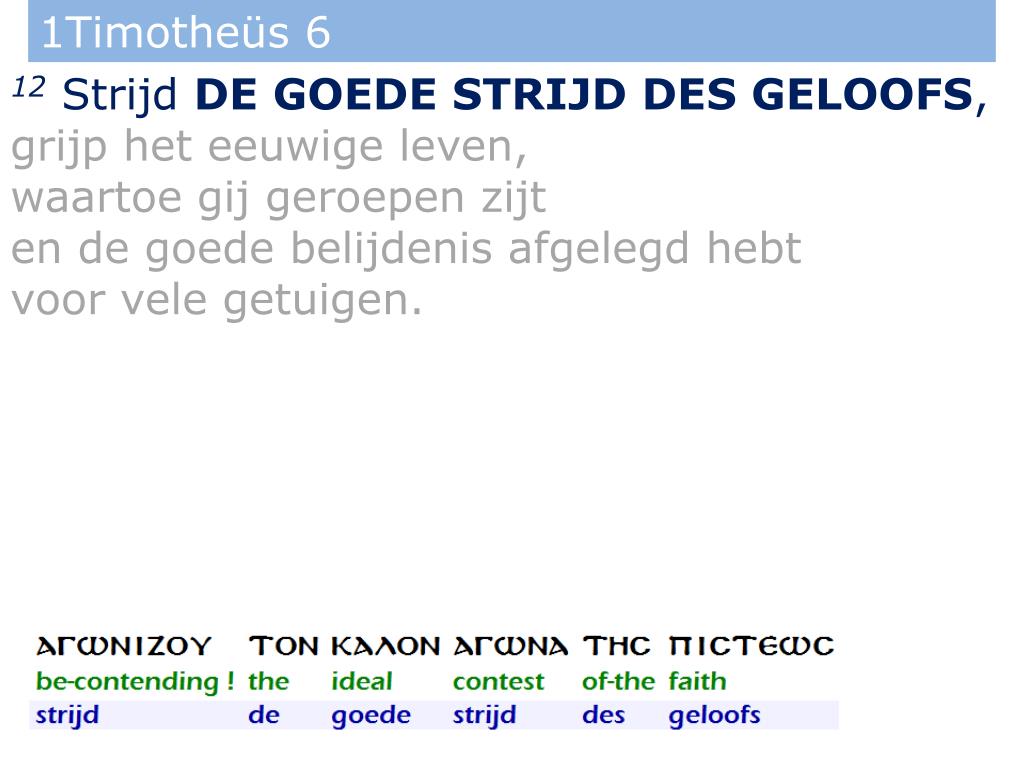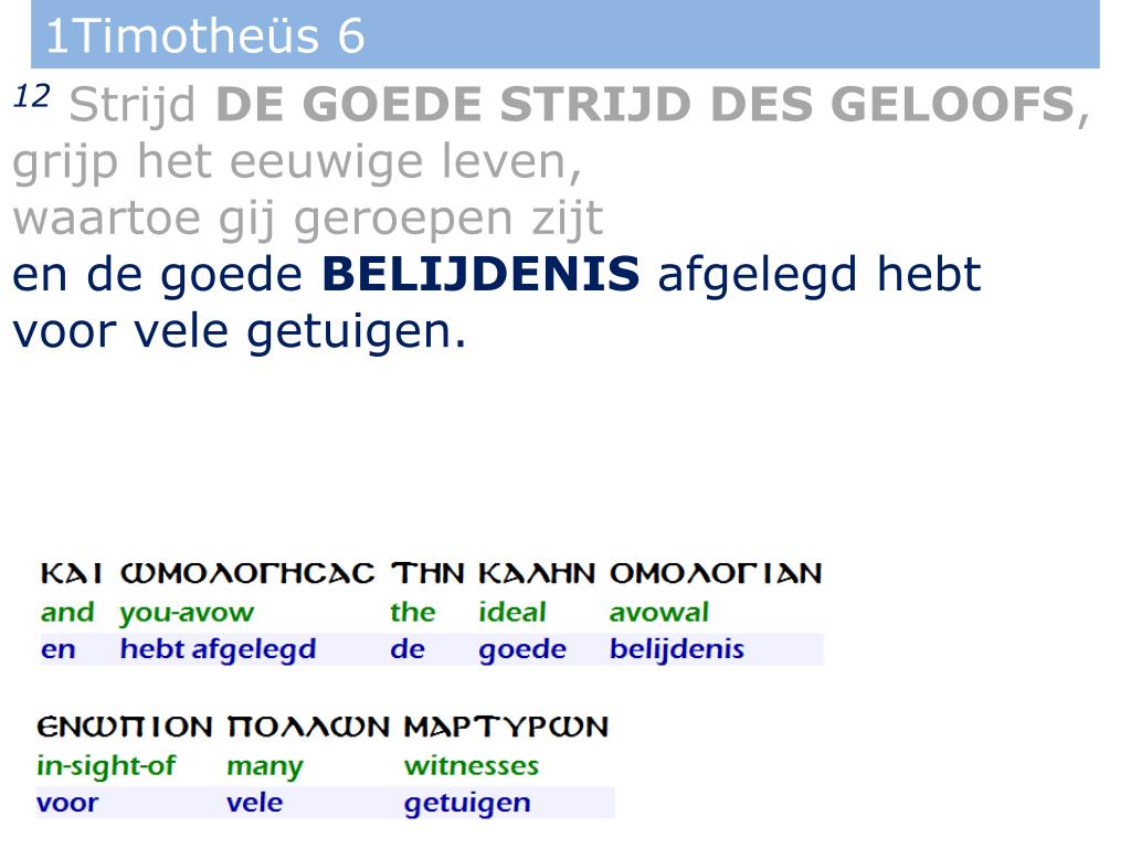 1Timotheüs 6 12Strijd DE GOEDE STRIJD DES GELOOFS, grijp het eeuwige leven, waartoe gij geroepen zijt en de goede BELIJDENIS afgelegd hebt voor vele getuigen.