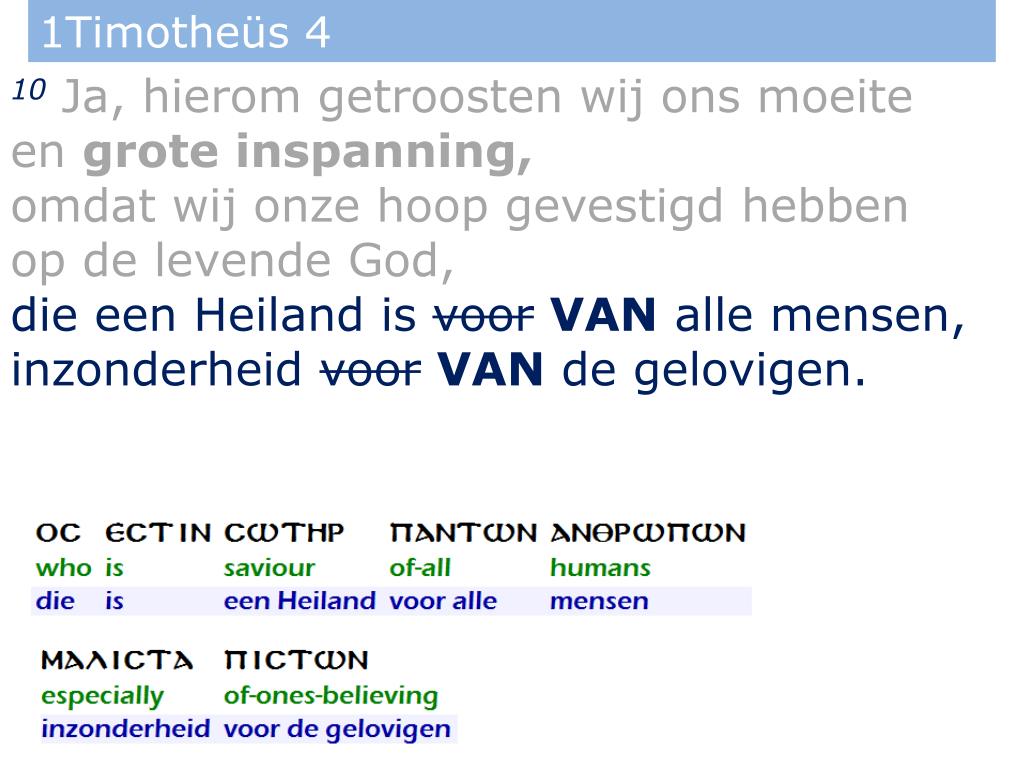 1Timotheüs 4 10Ja, hierom getroosten wij ons moeite en grote inspanning, omdat wij onze hoop gevestigd hebben op de levende God, die een Heiland is voorVAN alle mensen, inzonderheid voorVAN de gelovigen.