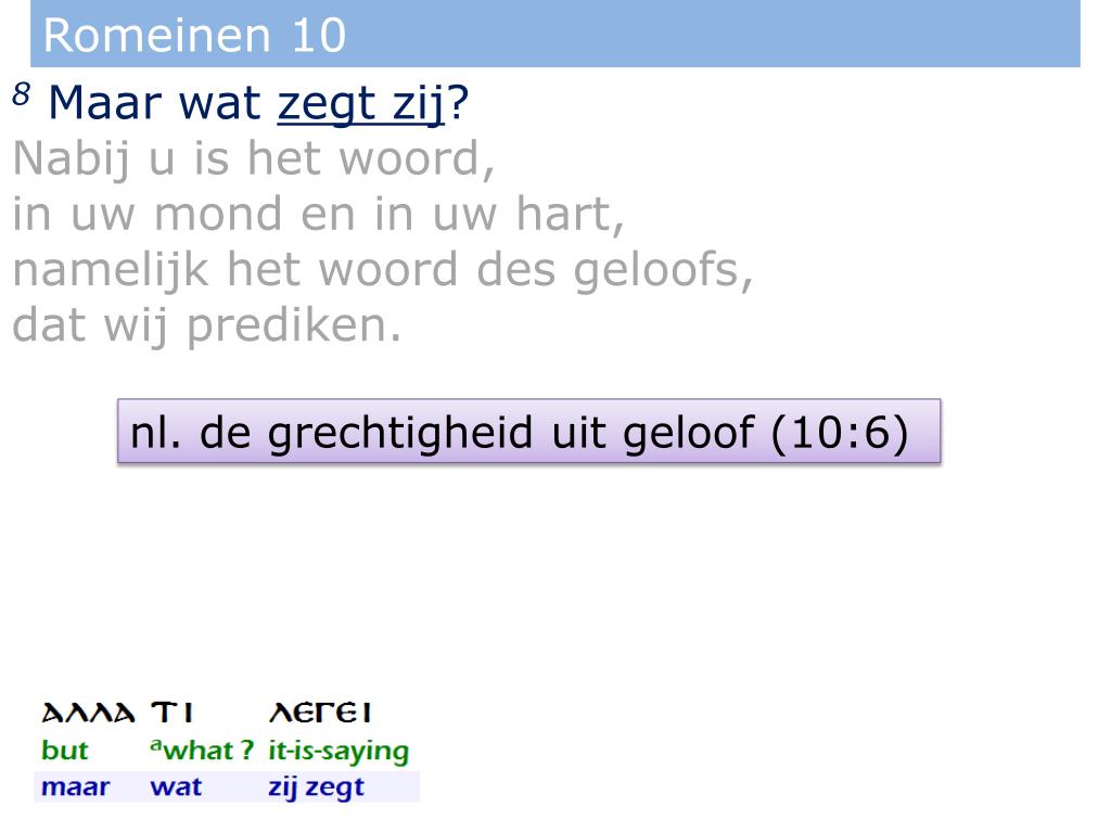 Romeinen 10 8 Maar wat zegt zij? Nabij u is het woord, in uw mond en in uw hart, namelijk het woord des geloofs, dat wij prediken. nl. de grechtigheid uit geloof (10:6)