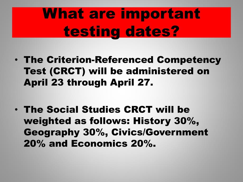 What are important testing dates? • The Criterion-Referenced Competency Test (CRCT) will be administered on April 23 through April 27. • The Social Studies CRCT will be weighted as follows: History 30%, Geography 30%, Civics/Government 20% and Economics 20%.
