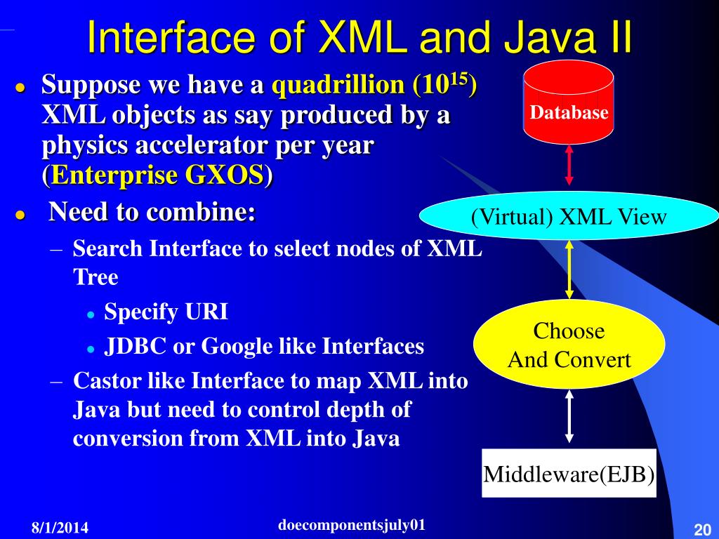 Interface of XML and Java II Database (Virtual) XML View Choose And Convert Middleware(EJB) • Suppose we have a quadrillion (1015) XML objects as say produced by a physics accelerator per year (Enterprise GXOS) • Need to combine: • Search Interface to select nodes of XML Tree • Specify URI • JDBC or Google like Interfaces • Castor like Interface to map XML into Java but need to control depth of conversion from XML into Java doecomponentsjuly01