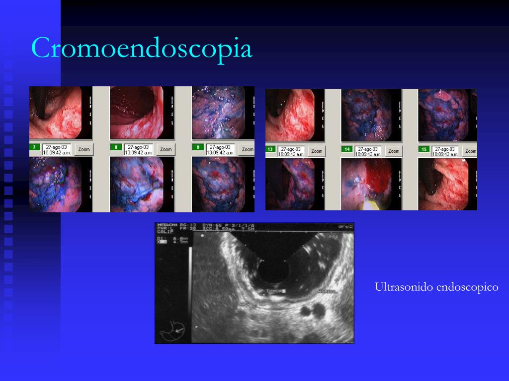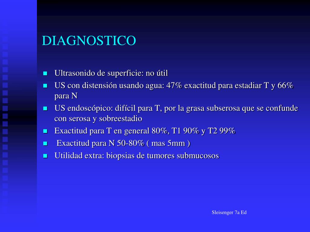DIAGNOSTICO Sleisenger 7a Ed Ultrasonido de superficie: no útil US con distensión usando agua: 47% exactitud para estadiar T y 66% para N US endoscópico: difícil para T, por la grasa subserosa que se confunde con serosa y sobreestadio Exactitud para T en general 80%, T1 90% y T2 99% Exactitud para N 50-80% ( mas 5mm ) Utilidad extra: biopsias de tumores submucosos