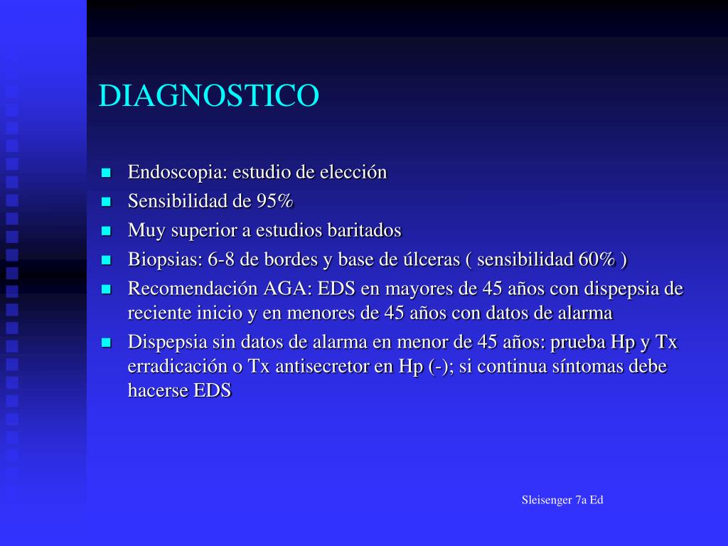 DIAGNOSTICO Sleisenger 7a Ed Endoscopia: estudio de elección Sensibilidad de 95% Muy superior a estudios baritados Biopsias: 6-8 de bordes y base de úlceras ( sensibilidad 60% ) Recomendación AGA: EDS en mayores de 45 años con dispepsia de reciente inicio y en menores de 45 años con datos de alarma Dispepsia sin datos de alarma en menor de 45 años: prueba Hp y Tx erradicación o Tx antisecretor en Hp (-); si continua síntomas debe hacerse EDS