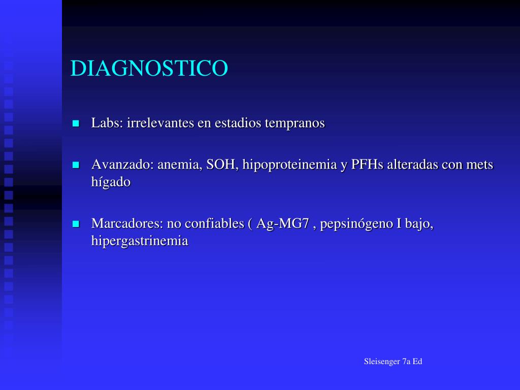 DIAGNOSTICO Sleisenger 7a Ed Labs: irrelevantes en estadios tempranos Avanzado: anemia, SOH, hipoproteinemia y PFHs alteradas con mets hígado Marcadores: no confiables ( Ag-MG7 , pepsinógeno I bajo, hipergastrinemia