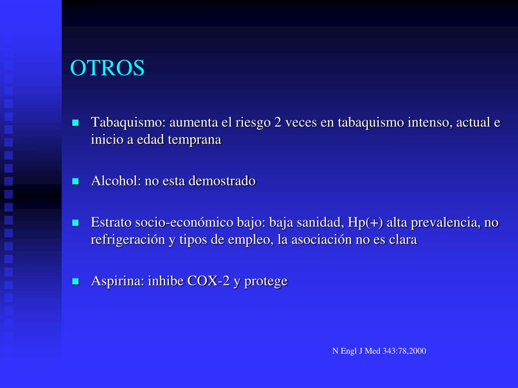 OTROS N Engl J Med 343:78,2000 Tabaquismo: aumenta el riesgo 2 veces en tabaquismo intenso, actual e inicio a edad temprana Alcohol: no esta demostrado Estrato socio-económico bajo: baja sanidad, Hp(+) alta prevalencia, no refrigeración y tipos de empleo, la asociación no es clara Aspirina: inhibe COX-2 y protege
