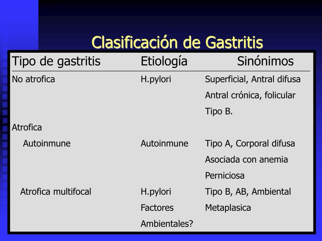 Clasificación de Gastritis Tipo de gastritis Etiología Sinónimos No atrofica H.pylori Superficial, Antral difusa Antral crónica, folicular Tipo B. Atrofica Autoinmune Autoinmune Tipo A, Corporal difusa Asociada con anemia Perniciosa Atrofica multifocal H.pylori Tipo B, AB, Ambiental Factores Metaplasica Ambientales?