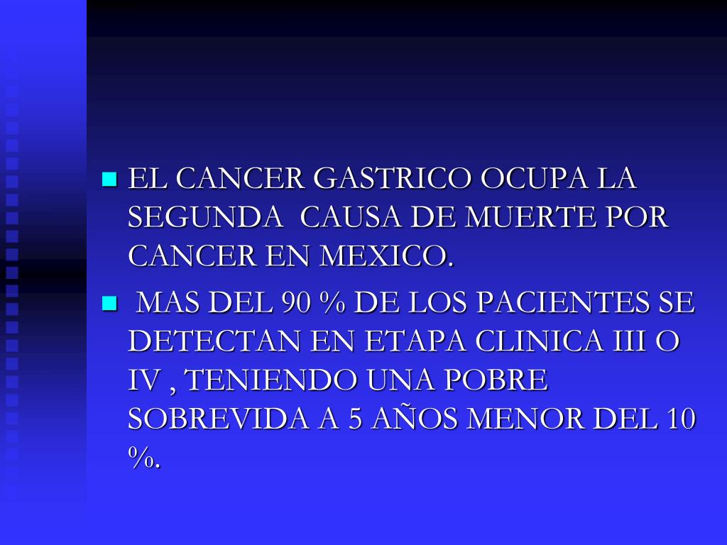 EL CANCER GASTRICO OCUPA LA SEGUNDA CAUSA DE MUERTE POR CANCER EN MEXICO. • MAS DEL 90 % DE LOS PACIENTES SE DETECTAN EN ETAPA CLINICA III O IV , TENIENDO UNA POBRE SOBREVIDA A 5 AÑOS MENOR DEL 10 %.