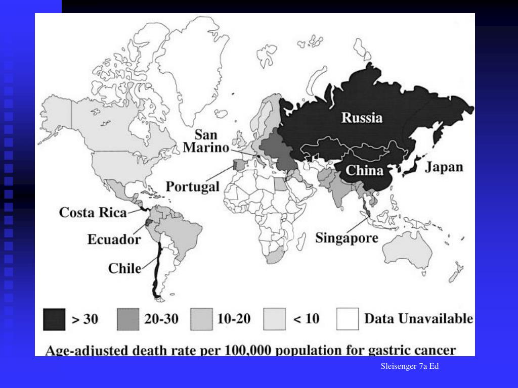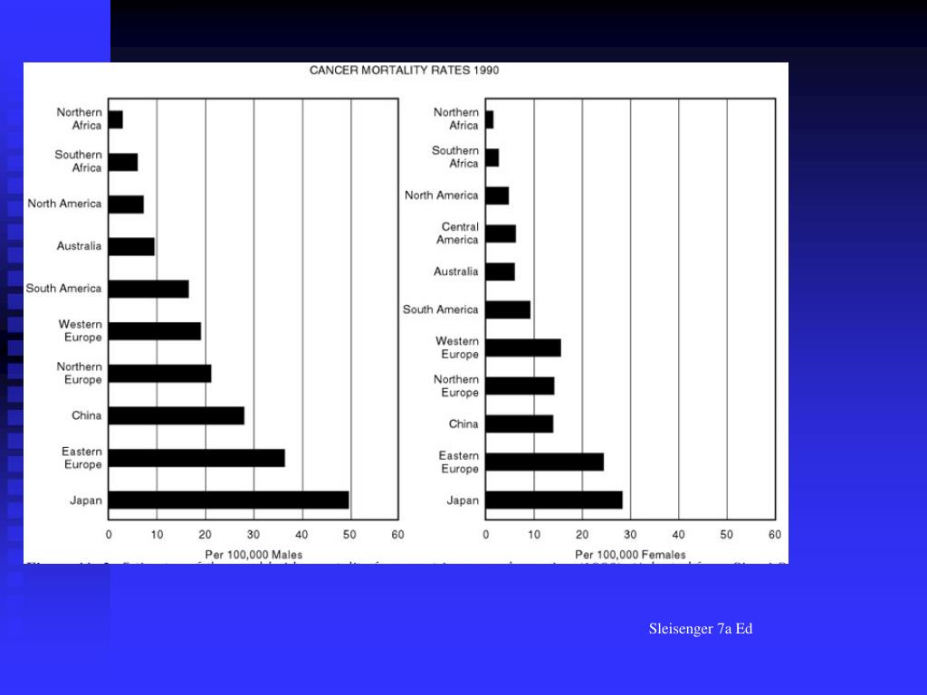 EPIDEMIOLOGIA Causa importante de muerte a nivel mundial La incidencia ha disminuido en países desarrollados Alta incidencia en oriente ( Japón 1er lugar y 4o en mortalidad ). Corea del sur, Costa Rica y la ex-URSS Baja incidencia Norteamérica, Australia, Europa Occidental y África Edad de presentación en EU 65-74 años ( media H 70 y M 74 ) Mortalidad global H 6.1 y M 2.8 x100 000 Cancer 83:18,1999