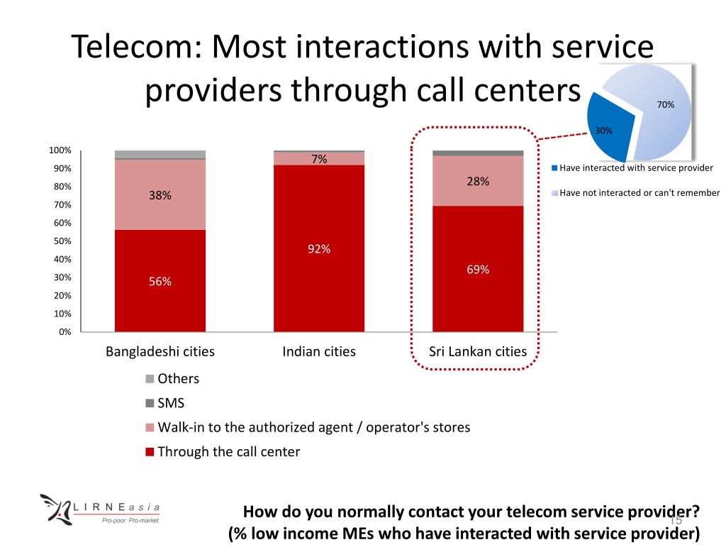 Telecom: Most interactions with service providers through call centers How do you normally contact your telecom service provider? (% low income MEs who have interacted with service provider)