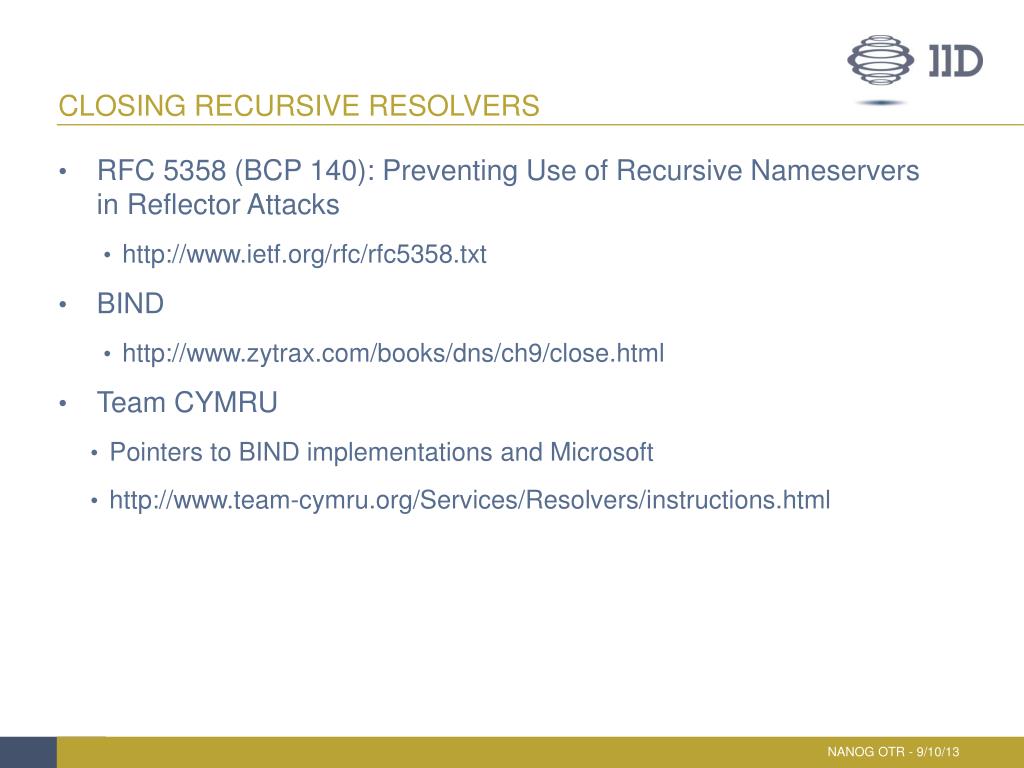 Closing Recursive Resolvers • RFC 5358 (BCP 140): Preventing Use of Recursive Nameservers in Reflector Attacks • http://www.ietf.org/rfc/rfc5358.txt • BIND • http://www.zytrax.com/books/dns/ch9/close.html • Team CYMRU • Pointers to BIND implementations and Microsoft • http://www.team-cymru.org/Services/Resolvers/instructions.html NANOG OTR - 9/10/13