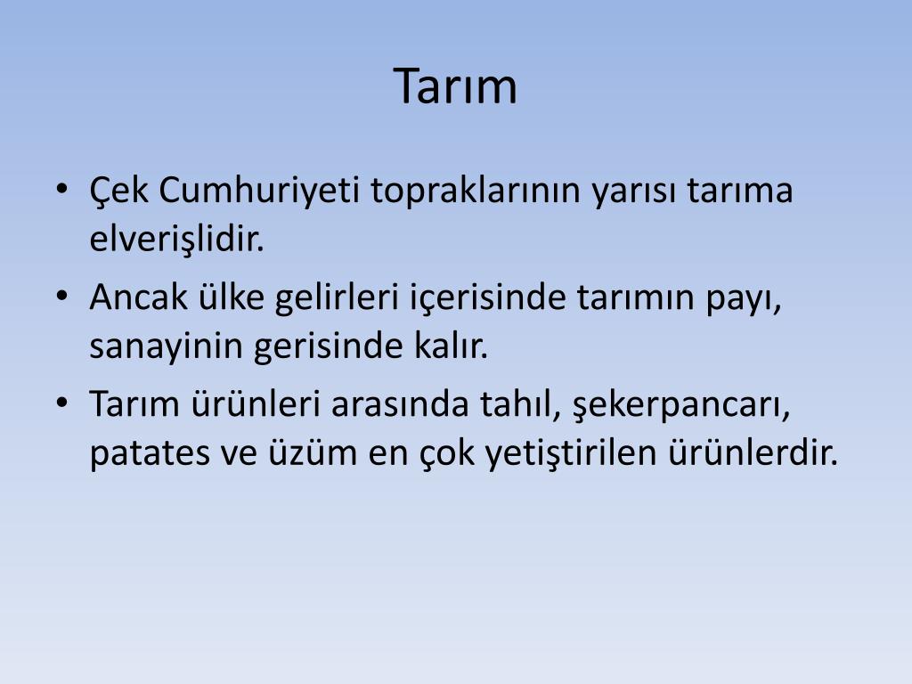 Tarım • Çek Cumhuriyeti topraklarının yarısı tarıma elverişlidir. • Ancak ülke gelirleri içerisinde tarımın payı, sanayinin gerisinde kalır. • Tarım ürünleri arasında tahıl, şekerpancarı, patates ve üzüm en çok yetiştirilen ürünlerdir.