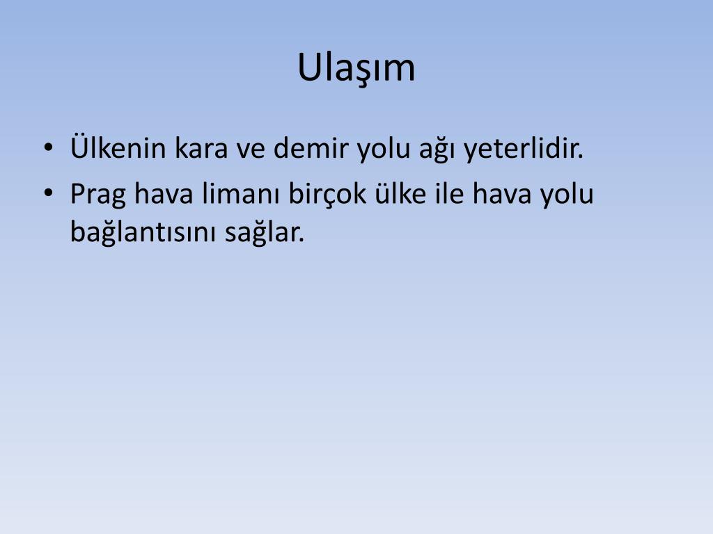 Ulaşım • Ülkenin kara ve demir yolu ağı yeterlidir. • Prag hava limanı birçok ülke ile hava yolu bağlantısını sağlar.