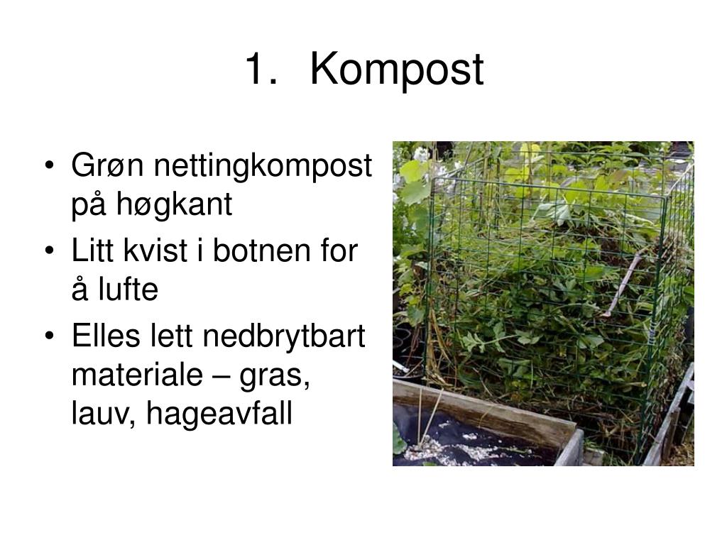 Kompost • Grøn nettingkompost på høgkant • Litt kvist i botnen for å lufte • Elles lett nedbrytbart materiale – gras, lauv, hageavfall