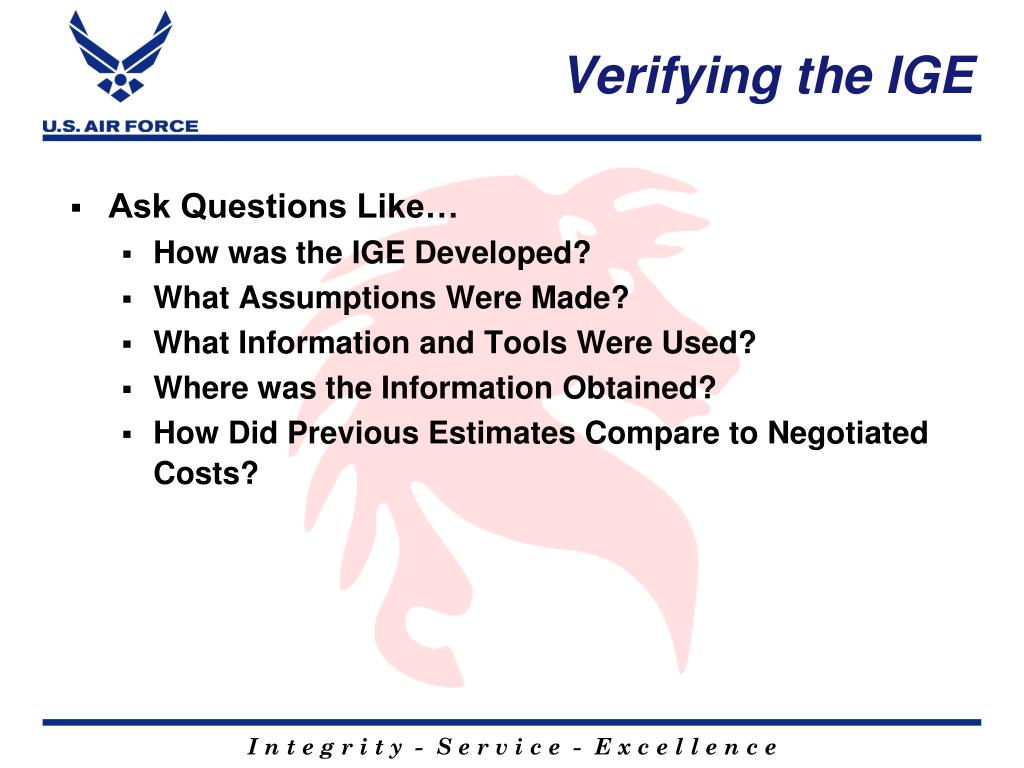 Verifying the IGE • Ask Questions Like… • How was the IGE Developed? • What Assumptions Were Made? • What Information and Tools Were Used? • Where was the Information Obtained? • How Did Previous Estimates Compare to Negotiated Costs?