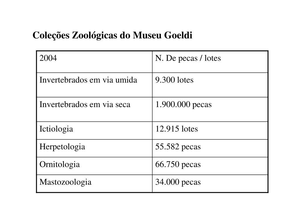 Museu Paraense Emílio Goeldi. Coleções Biológicas. Botânica. Herbário Xiloteca Palinoteca Carpoteca Histoteca Essências. 190.000 peças. Zoologia. Herpetologia Ornintologia Mastozoologia Ictiologia Entomologia Invertebrados ñ Insetos. 1.929.120 peças. Abrangência geográfica.