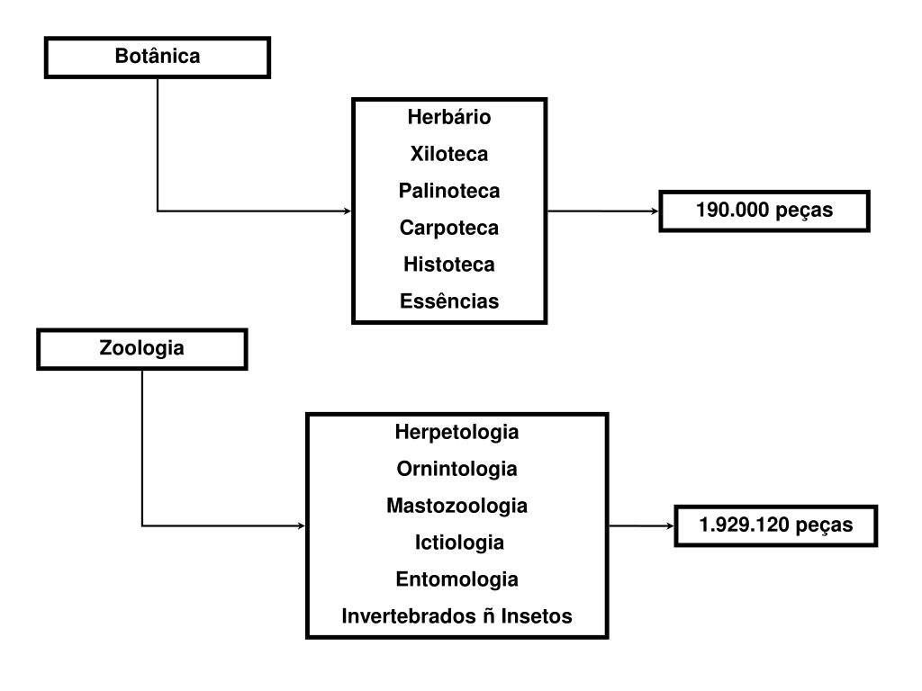 Botânica Herbário Xiloteca Palinoteca Carpoteca Histoteca Essências 190.000 peças Zoologia Herpetologia Ornintologia Mastozoologia Ictiologia Entomologia Invertebrados ñ Insetos 1.929.120 peças