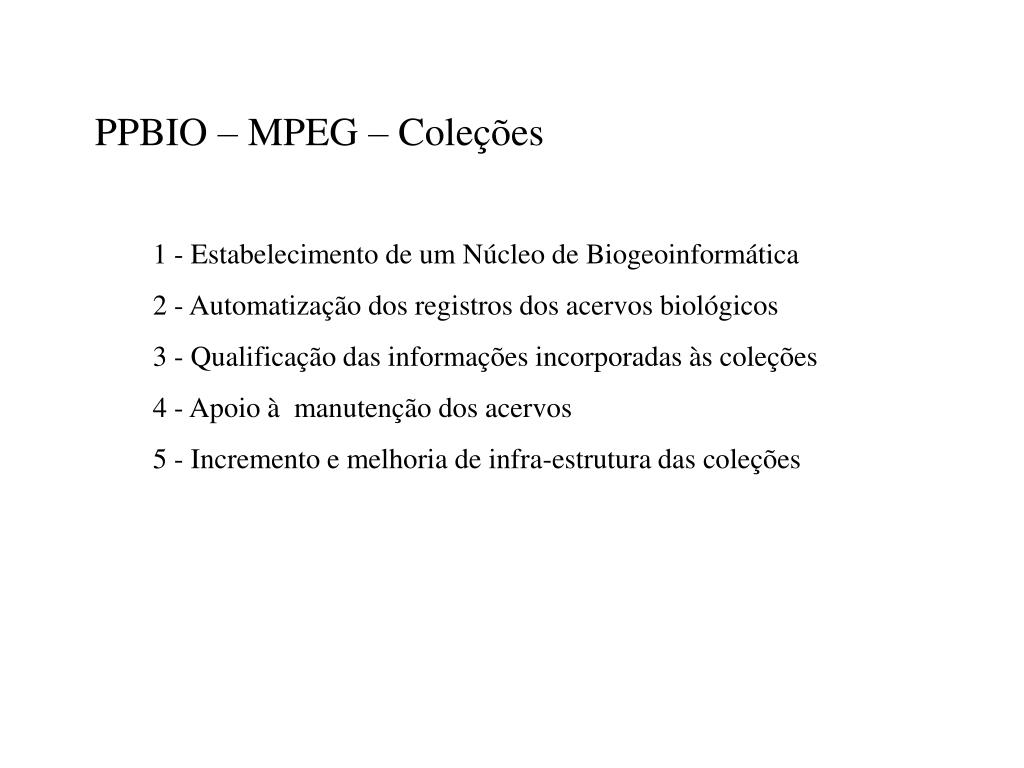 PPBIO – MPEG – Coleções 1 - Estabelecimento de um Núcleo de Biogeoinformática 2 - Automatização dos registros dos acervos biológicos 3 - Qualificação das informações incorporadas às coleções 4 - Apoio à manutenção dos acervos 5 - Incremento e melhoria de infra-estrutura das coleções