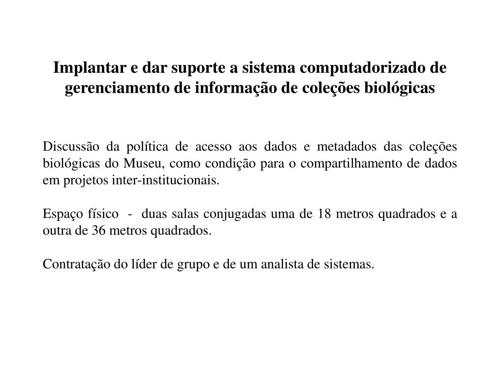 Implantar e dar suporte a sistema computadorizado de gerenciamento de informação de coleções biológicas Discussão da política de acesso aos dados e metadados das coleções biológicas do Museu, como condição para o compartilhamento de dados em projetos inter-institucionais. Espaço físico - duas salas conjugadas uma de 18 metros quadrados e a outra de 36 metros quadrados. Contratação do líder de grupo e de um analista de sistemas.