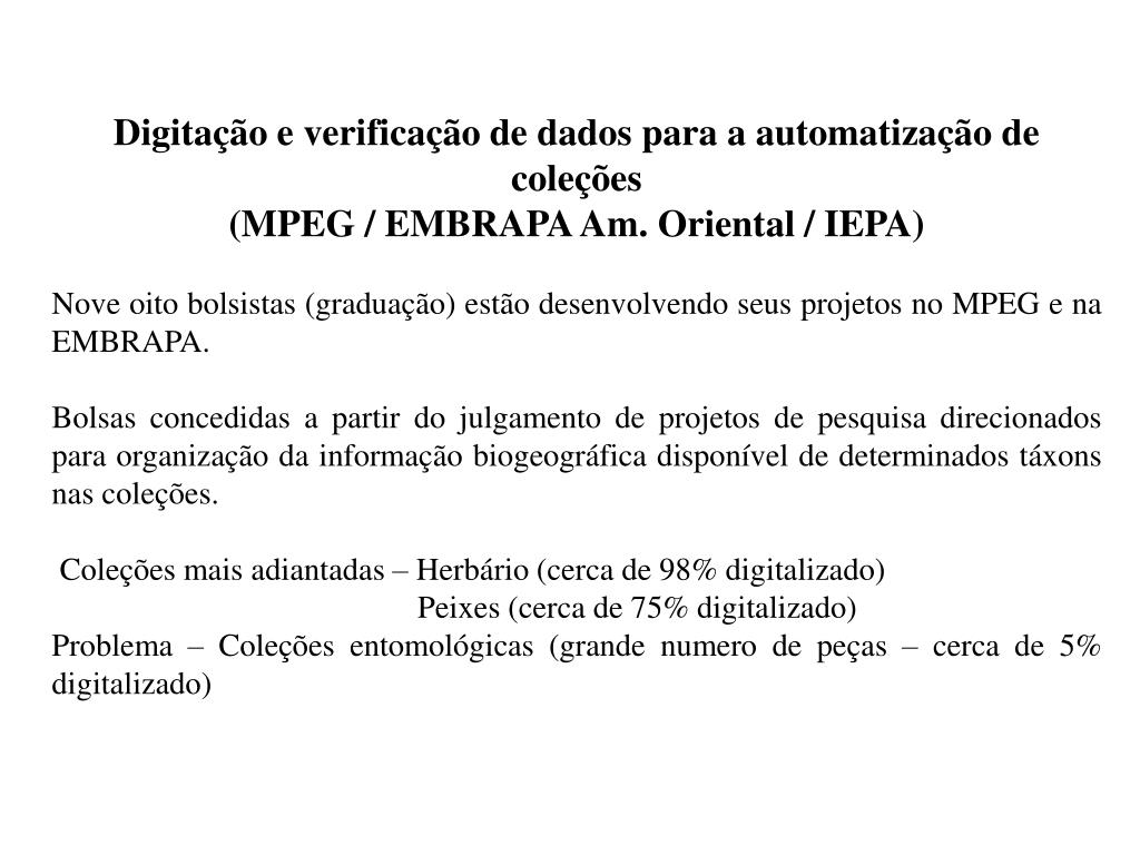 Digitação e verificação de dados para a automatização de coleções (MPEG / EMBRAPA Am. Oriental / IEPA) Nove oito bolsistas (graduação) estão desenvolvendo seus projetos no MPEG e na EMBRAPA. Bolsas concedidas a partir do julgamento de projetos de pesquisa direcionados para organização da informação biogeográfica disponível de determinados táxons nas coleções. Coleções mais adiantadas – Herbário (cerca de 98% digitalizado) Peixes (cerca de 75% digitalizado) Problema – Coleções entomológicas (grande numero de peças – cerca de 5% digitalizado)