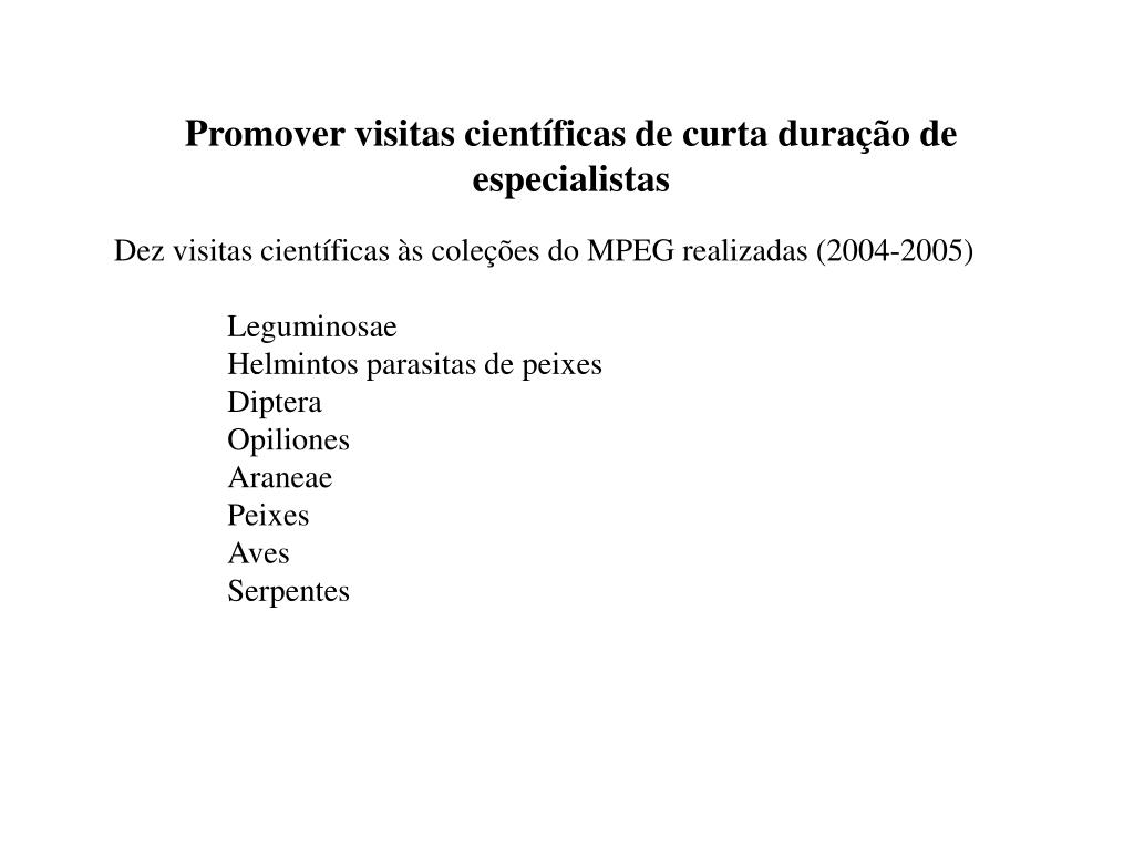 Promover visitas científicas de curta duração de especialistas Dez visitas científicas às coleções do MPEG realizadas (2004-2005) Leguminosae Helmintos parasitas de peixes Diptera Opiliones Araneae Peixes Aves Serpentes