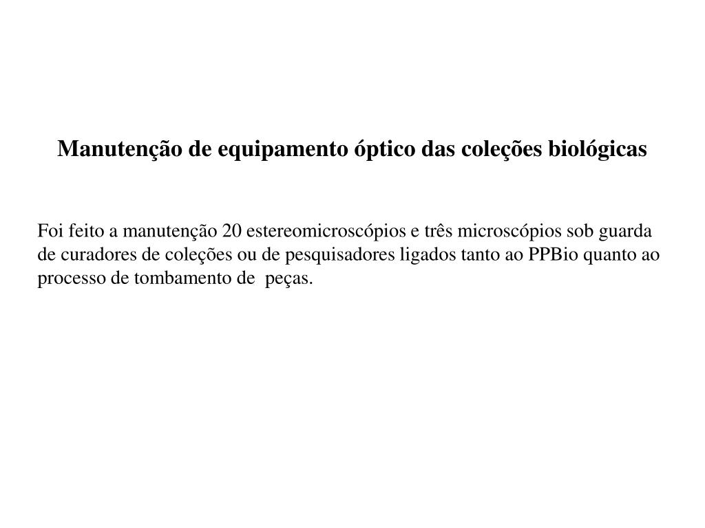 Manutenção de equipamento óptico das coleções biológicas Foi feito a manutenção 20 estereomicroscópios e três microscópios sob guarda de curadores de coleções ou de pesquisadores ligados tanto ao PPBio quanto ao processo de tombamento de peças.