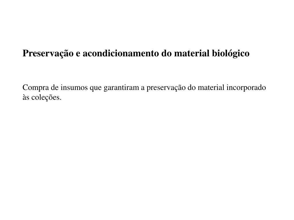 Preservação e acondicionamento do material biológico Compra de insumos que garantiram a preservação do material incorporado às coleções.