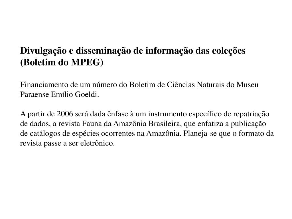 Divulgação e disseminação de informação das coleções (Boletim do MPEG) Financiamento de um número do Boletim de Ciências Naturais do Museu Paraense Emílio Goeldi. A partir de 2006 será dada ênfase à um instrumento específico de repatriação de dados, a revista Fauna da Amazônia Brasileira, que enfatiza a publicação de catálogos de espécies ocorrentes na Amazônia. Planeja-se que o formato da revista passe a ser eletrônico.