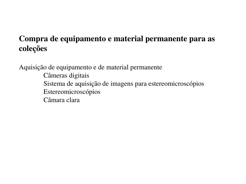 Compra de equipamento e material permanente para as coleções Aquisição de equipamento e de material permanente Câmeras digitais Sistema de aquisição de imagens para estereomicroscópios Estereomicroscópios Câmara clara