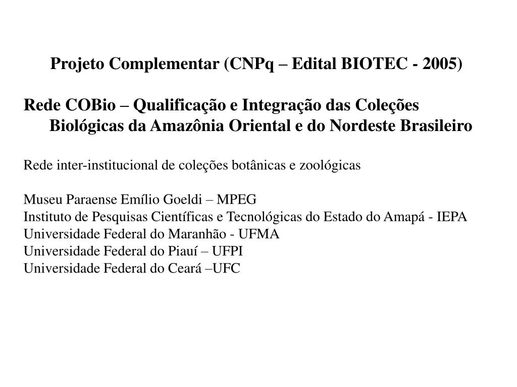 Projeto Complementar (CNPq – Edital BIOTEC - 2005) Rede COBio – Qualificação e Integração das Coleções Biológicas da Amazônia Oriental e do Nordeste Brasileiro Rede inter-institucional de coleções botânicas e zoológicas Museu Paraense Emílio Goeldi – MPEG Instituto de Pesquisas Científicas e Tecnológicas do Estado do Amapá - IEPA Universidade Federal do Maranhão - UFMA Universidade Federal do Piauí – UFPI Universidade Federal do Ceará –UFC