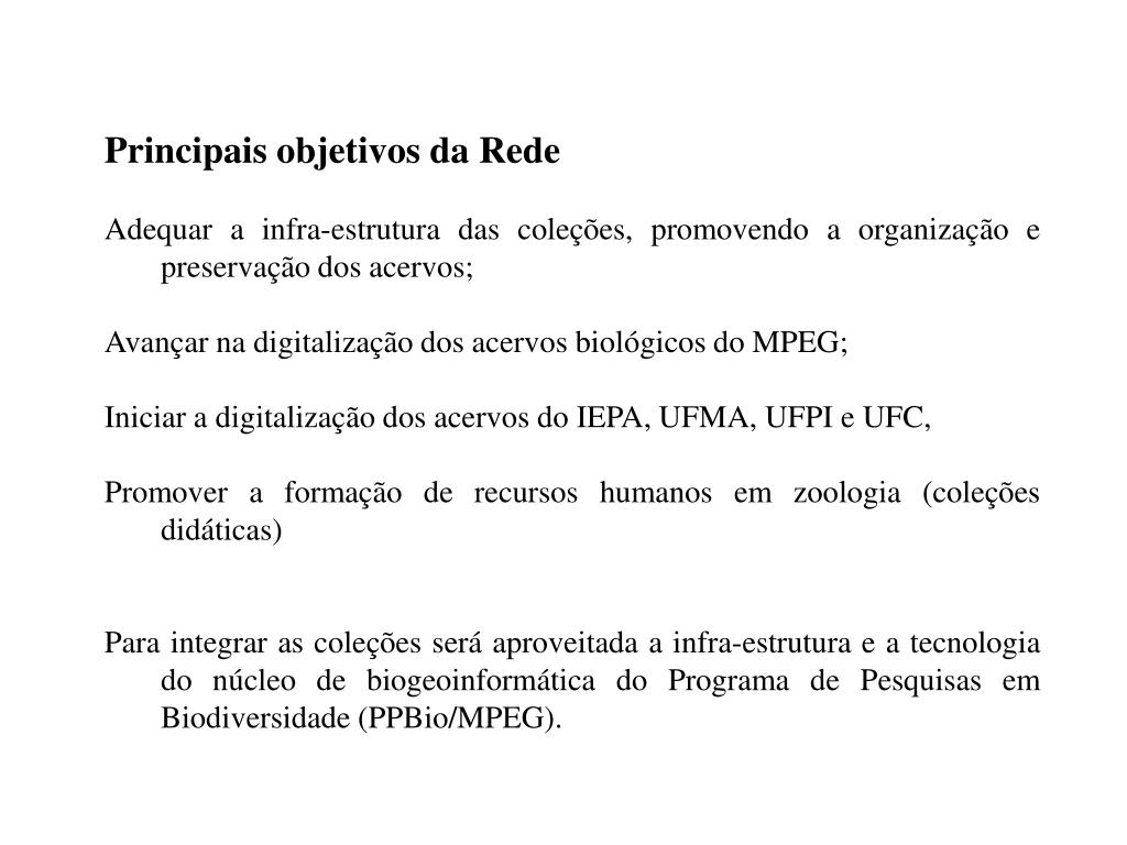 Principais objetivos da Rede Adequar a infra-estrutura das coleções, promovendo a organização e preservação dos acervos; Avançar na digitalização dos acervos biológicos do MPEG; Iniciar a digitalização dos acervos do IEPA, UFMA, UFPI e UFC, Promover a formação de recursos humanos em zoologia (coleções didáticas) Para integrar as coleções será aproveitada a infra-estrutura e a tecnologia do núcleo de biogeoinformática do Programa de Pesquisas em Biodiversidade (PPBio/MPEG).