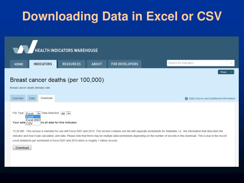 Tabulate, chart, map, download: Pre-tabulated health indicators. Objectives. By the end of today’s workshop, you should: Understand the website’s general benefits and limitations Know how to navigate to and through the Health Indicators Warehouse website