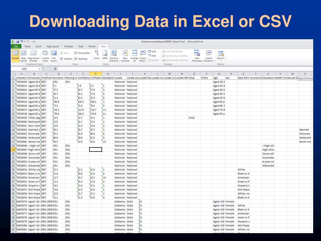 Some considerations • Estimates may be single-year or multiple-year • Pooled years for greater precision in some cases • Ability to show estimates for demographic sub-groups • Some tables will have time trends • Data suppression • Some estimates may be suppressed based on small numbers or on the basis of confidentiality, as defined by the data provider.