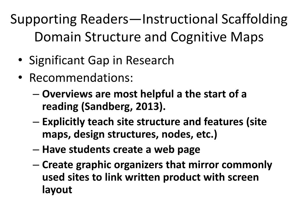 Supporting Readers—Instructional ScaffoldingDomain Structure and Cognitive Maps • Significant Gap in Research • Recommendations: • Overviews are most helpful a the start of a reading (Sandberg, 2013). • Explicitly teach site structure and features (site maps, design structures, nodes, etc.) • Have students create a web page • Create graphic organizers that mirror commonly used sites to link written product with screen layout