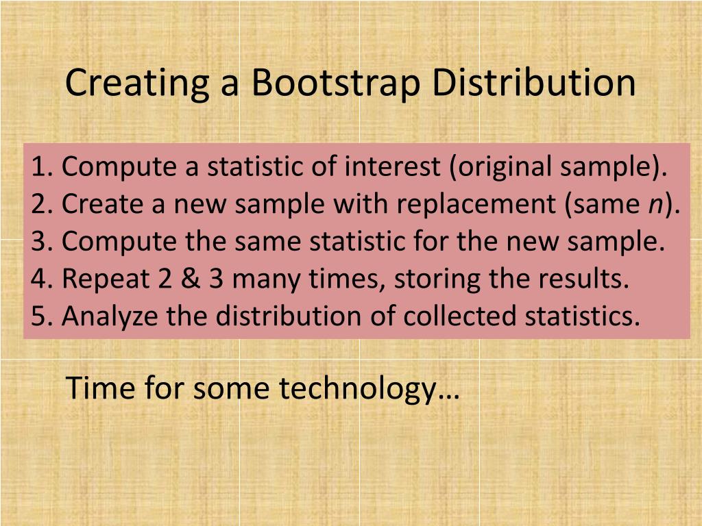 Creating a Bootstrap Distribution 1. Compute a statistic of interest (original sample). 2. Create a new sample with replacement (same n). 3. Compute the same statistic for the new sample. 4. Repeat 2 & 3 many times, storing the results. 5. Analyze the distribution of collected statistics. Time for some technology…