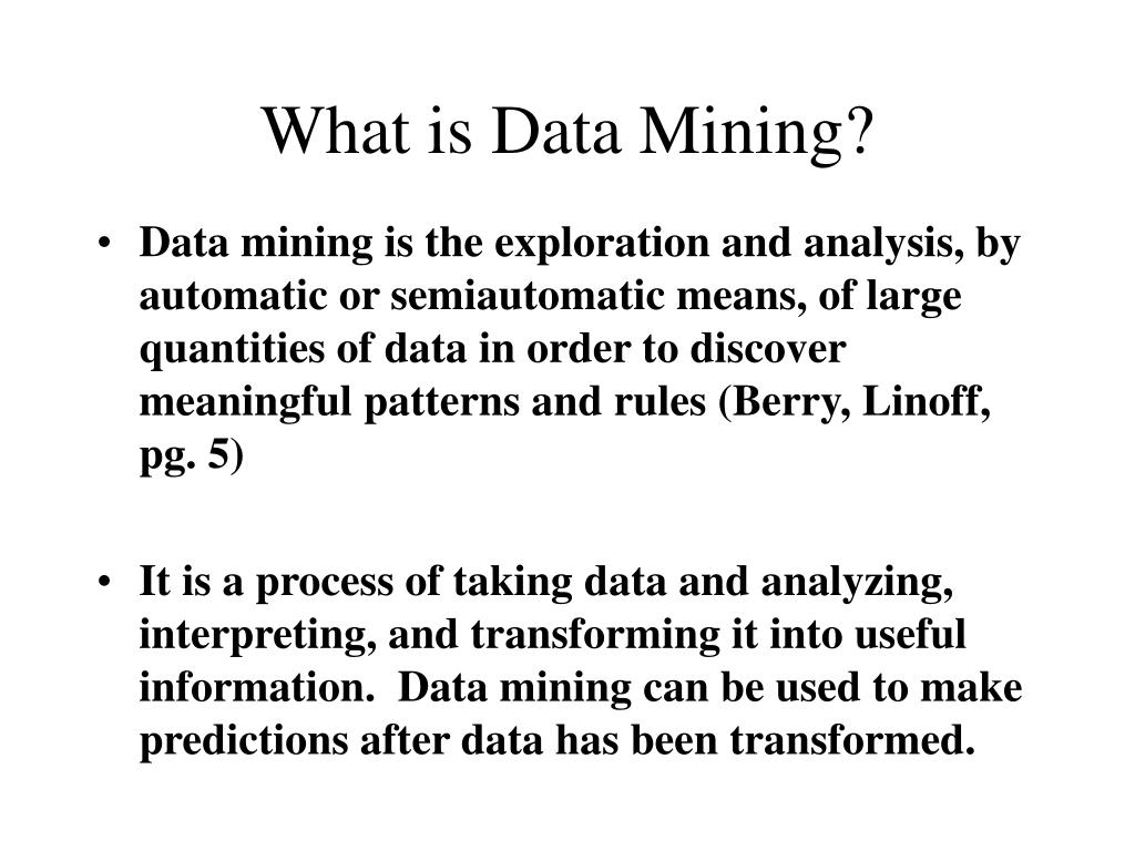 What is Data Mining? • Data mining is the exploration and analysis, by automatic or semiautomatic means, of large quantities of data in order to discover meaningful patterns and rules (Berry, Linoff, pg. 5) • It is a process of taking data and analyzing, interpreting, and transforming it into useful information. Data mining can be used to make predictions after data has been transformed.