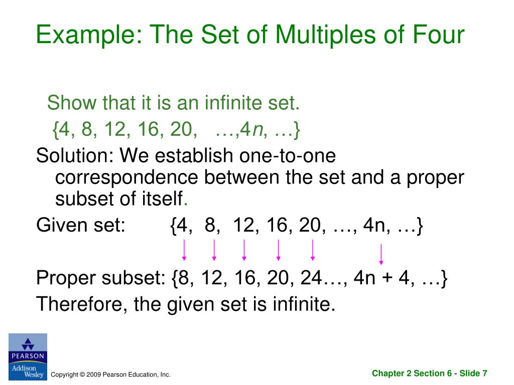 Example: The Set of Multiples of Four Show that it is an infinite set. {4, 8, 12, 16, 20, …,4n, …} Solution: We establish one-to-one correspondence between the set and a proper subset of itself. Given set: {4, 8, 12, 16, 20, …, 4n, …} Proper subset: {8, 12, 16, 20, 24…, 4n + 4, …} Therefore, the given set is infinite.